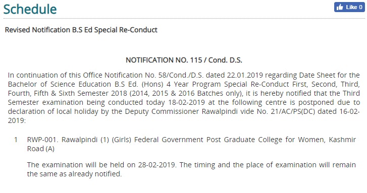 Lahore, University of the Punjab has issued the PU BS.Ed date sheet special re-conduct semester 2018 exams. Punjab University exams department has issued the PU BS.Ed special re-conduct exams date sheet 2018 and the students will note the changed dates and schedule of the papers. According to the PU BS.ED revised date sheet 2018, the paper being held on 18-2-2019 at Federal Government Post graduate college Kashmir Road was postponed and now the students will note the new as the PU BS.Ed special re-conduct 2018 paper of this said date will be held at the same center on 28-2-2019. The time and place will remain same as already announced.