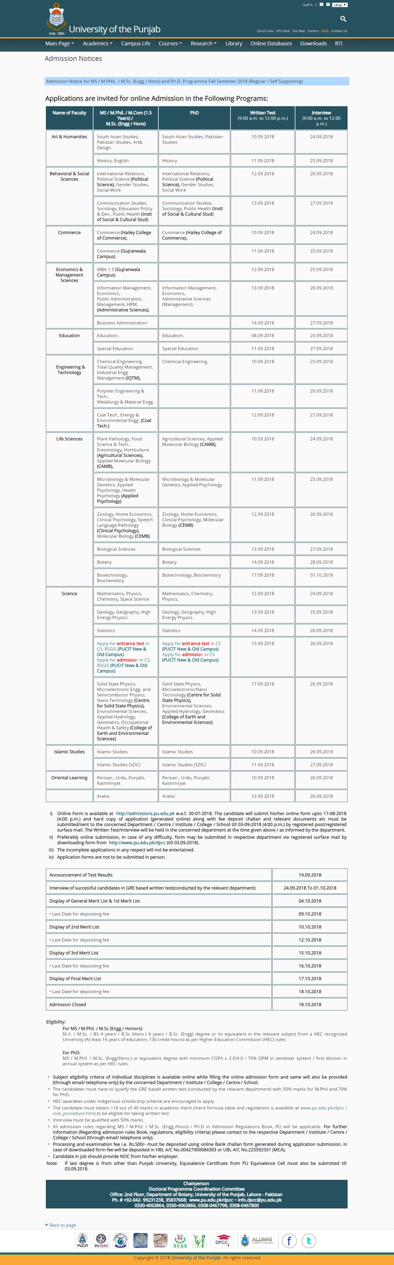 Lahore, University of the Punjab has announced the online admission in the PU MS, MPhil, M.Com, MSc and PhD programs in different disciplines. The students, who have already submitted their admission forms, they can appear in the written test on the dates mentioned by the concerned departments. The interviews of the successful candidates will be conducted. The general merit list and first merit list will be displayed on 04-10-2018 and the fee will be deposited by 09-10-2018. The university will display the second merit list on 10-10-2018 and the students of the 2nd merit list will pay admission fee by 12-10-2018. The admission department of Punjab University will display third merit list by 15-10-2018 and the fee will be paid by 16-10-2018 and the final merit list will be displayed on 17-10-2018 and the fee will be deposited by 18-10-2018.