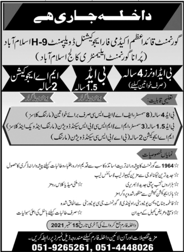 Government Quaid e Azam Academy For Educational Development H-9 Islamabad has intended to open Admissions and looking for Applications for Admissions in B.Ed Hons 4 Years, B.Ed Hons 1.5 Years, MA in Education 2 Years for Session 2021. Interested candidates shall send their Applications for Admissions with effect from September 15, 2021. Candidates may apply, Admissions are ongoing.