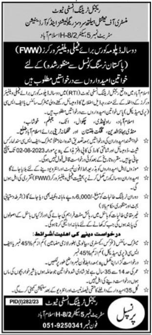 Regional Training Institute is delighted to announce admissions for the year 2023 in the esteemed Diploma in Family Welfare Worker FWW program. Aspiring candidates with a passion for healthcare and social welfare can apply. To be eligible, applicants must have completed their Matric in Science and FSc Pre Medical, obtaining at least 45% marks.