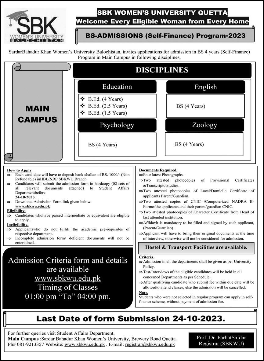 The last date for submitting admission forms is October 24, 2023. For any further inquiries or assistance, students can visit the Student Affairs Department at the main campus, Sardar Bahadur Khan Womens University, Brewery Road, Quetta, .