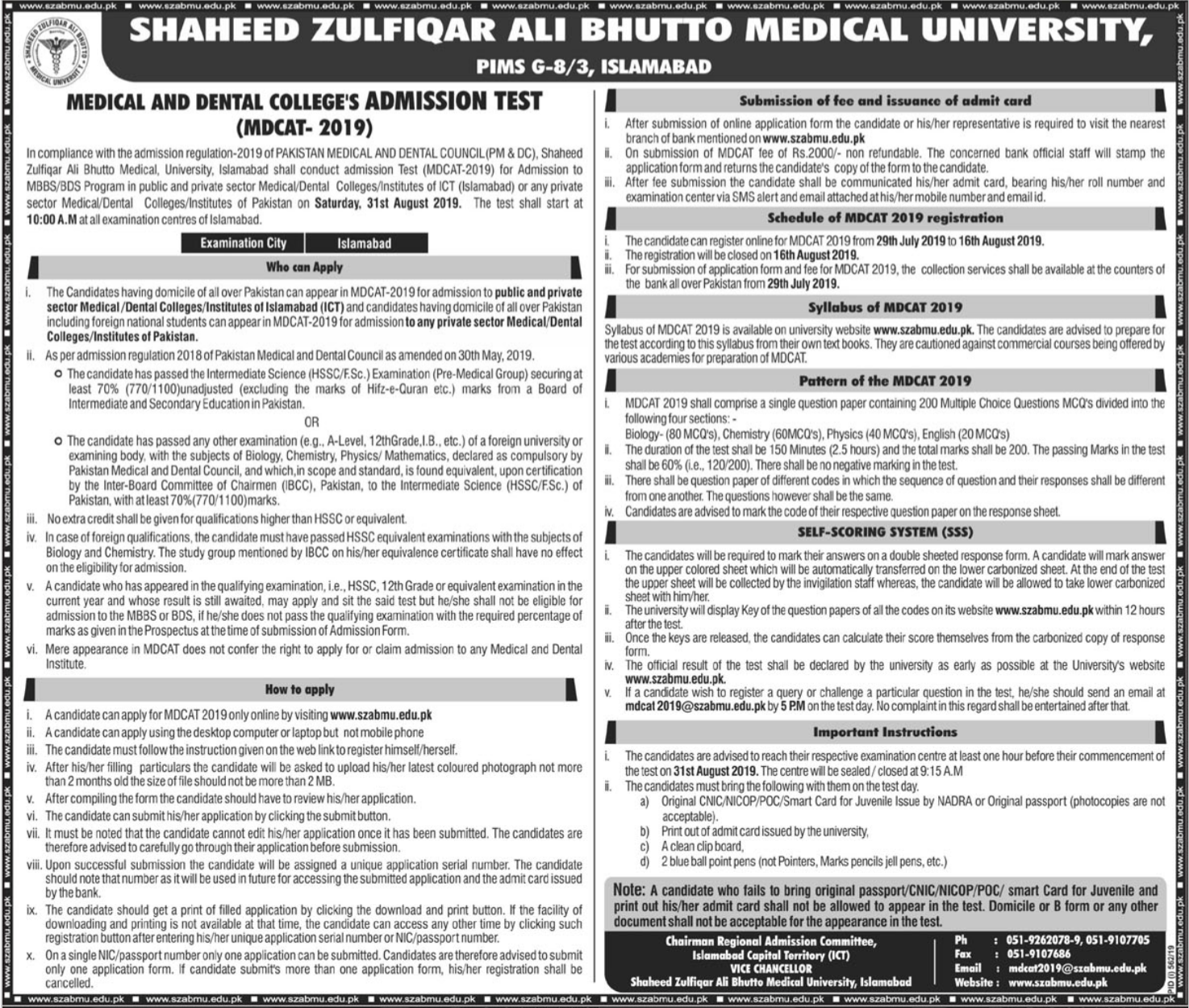 Shaheed Zulfiqar Ali Bhutto Medical University opens Admission in Medical and Dental College in Islamabad.