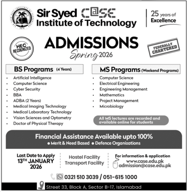 Sir Syed CASE Institute of Technology, a HEC-recognized and federally chartered institution, is now accepting applications for Spring 2026 admissions. With 25 years of excellence in higher education, CASE offers industry-relevant programs designed to prepare students for successful professional careers in technology, engineering, management, and health sciences.