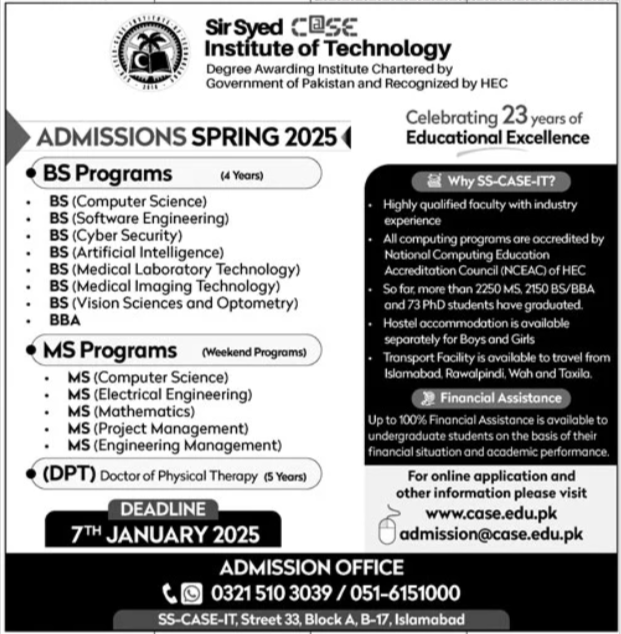 Sir Syed Case Institute of Technology is now accepting applications for Admissions 2025 in a variety of undergraduate and graduate programs. The courses offered include BS Computer Science, BS Software Engineering, BS Cyber Security, BS Artificial Intelligence, BS Medical Laboratory Technology, BS Medical Imaging Technology, BS Vision Sciences & Optometry, BBA, MS Computer Science, MS Electrical Engineering, MS Mathematics, MS Project Management, MS Engineering Management, and DPT. These programs cater to a diverse range of academic interests and provide students with the skills needed to excel in the technology, healthcare, and management sectors.