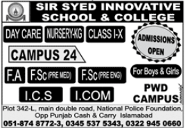 Sir Syed Innovative School and College has announced admissions 2020 in Day Care Center, Nursery, KG, Class One to Matric, FA, F.Sc Pre Engineering, Pre Medical, ICS, I.Com in Islamabad.