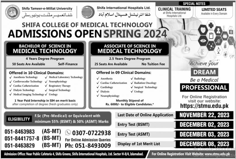 STMU Shifa Tameer-e-Millat University AS-MT BS-MT Islamabad Admission 2023