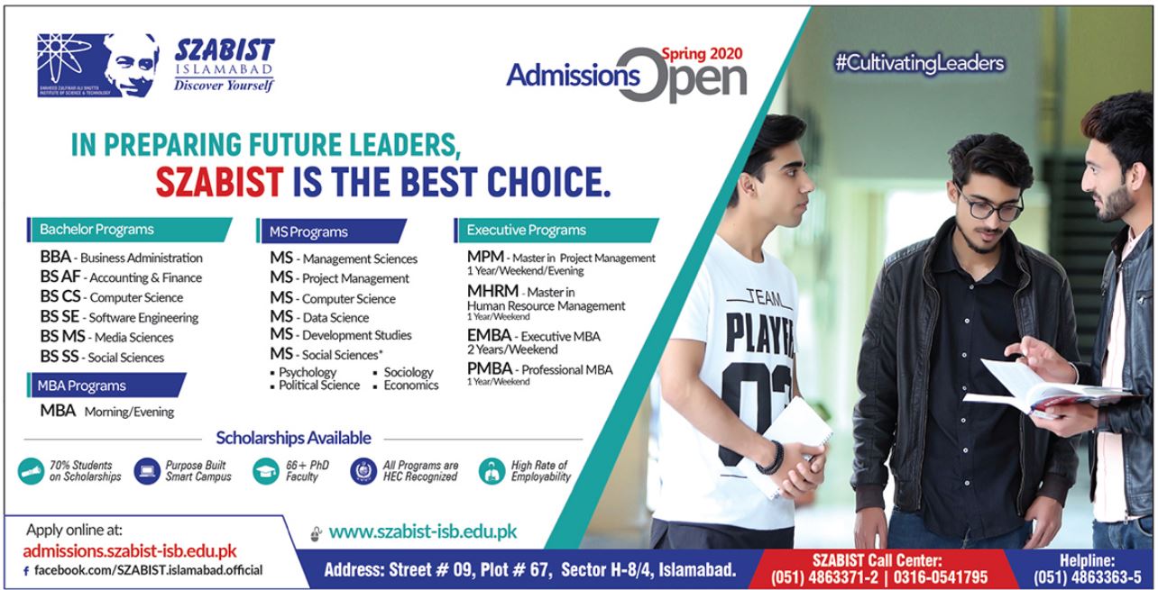 SZABIST BBA BS MS MBA MPM admissions 2020