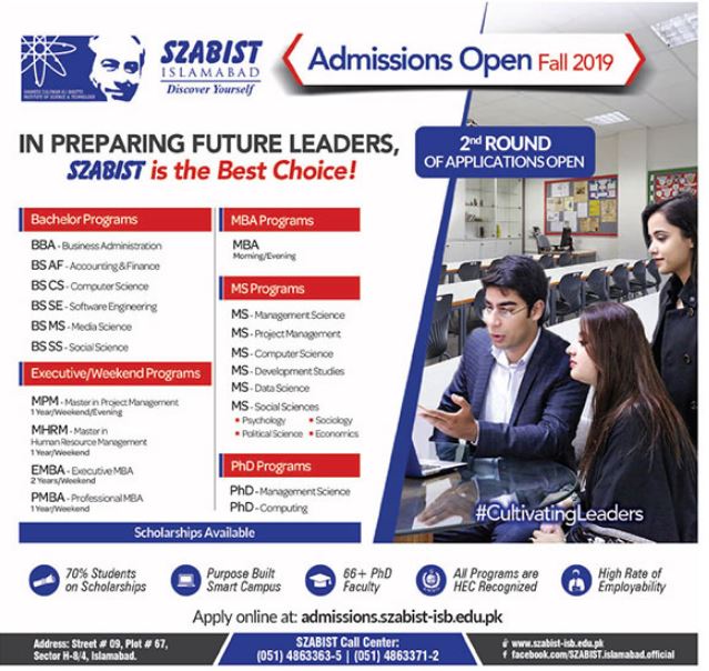 Shaheed Zulfiqar Ali Bhutto Institute of Science & Technology Islamabad has offered admission for BS in Computer sciences, Media sciences, Software Engineering, Social science, Accounting & Finance, MBA, BBA, MS in Data science, Management sciences, Computer science, PhD in Management science, Computing.