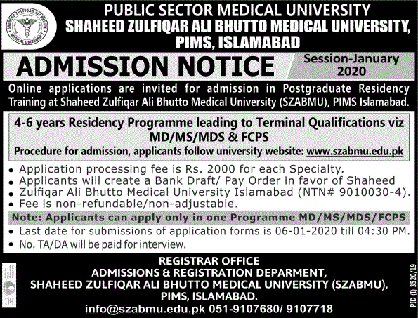 Shaheed Zulfiqar Ali Bhutto Medical University PIMS Islamabad has offered admissions for Postgraduate Residency Training in MD/MS/MDS & FCPS. Last date for submission of admission applications is 06 Jan 2020.