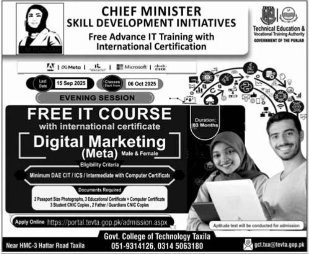 Govt. College of Technology, Taxila, in collaboration with TEVTA Technical Education & Vocational Training Authority, Government of Punjab, announces Admissions Open for a FREE evening IT training course under the Chief Minister’s Skill Development Initiative.