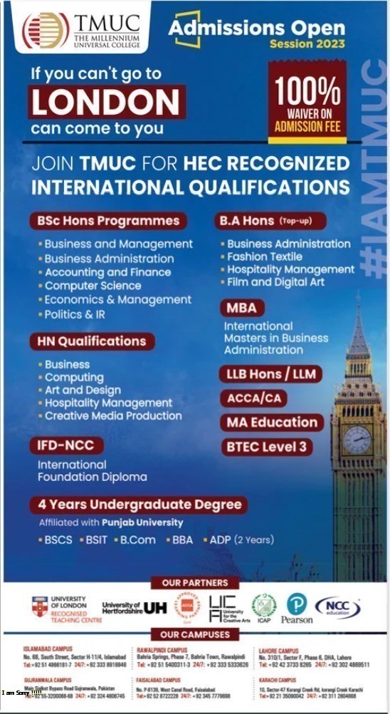 The Millennium Universal College is thrilled to announce its Admission 2023, offering diverse academic opportunities in Computer Sciences, Information Technology, Business Administration, Accounting and Finance, MBA, LLB, ACCA/CA, and MA Education. Aspiring students seeking excellence in these fields can now embark on a transformative educational journey at our esteemed institution. With a rich curriculum and state-of-the-art facilities, we foster an environment conducive to holistic growth and intellectual development. Our experienced faculty ensures personalized attention and guidance, empowering students to reach their full potential. Join us in shaping the leaders of tomorrow, equipped with cutting-edge knowledge and skills to excel in a dynamic world. Dont miss the chance to be part of an inclusive and vibrant academic community; apply now for an extraordinary educational experience at The Millennium Universal College.