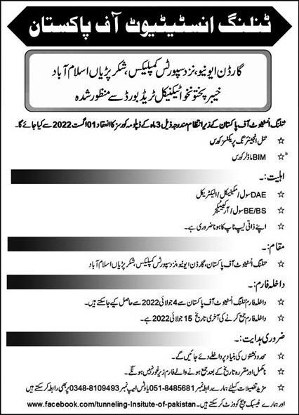 Tunneling Institute of Pakistan Islamabad is proposed to be offered TIP Admissions 2022. Applications are being invited by Tunneling Institute of Pakistan Islamabad on prescribed form for granting TIP Diploma Admissions 2022 for Academic Session 2022. TIP Courses Admissions 2022 are open in Tunnel Engineering Practices, VIM Models. Candidates shall send their applications for Tunneling Institute of Pakistan Islamabad Admissions 2022 on or before July 15, 2022. Tunneling Institute of Pakistan Admissions 2022 are open now.