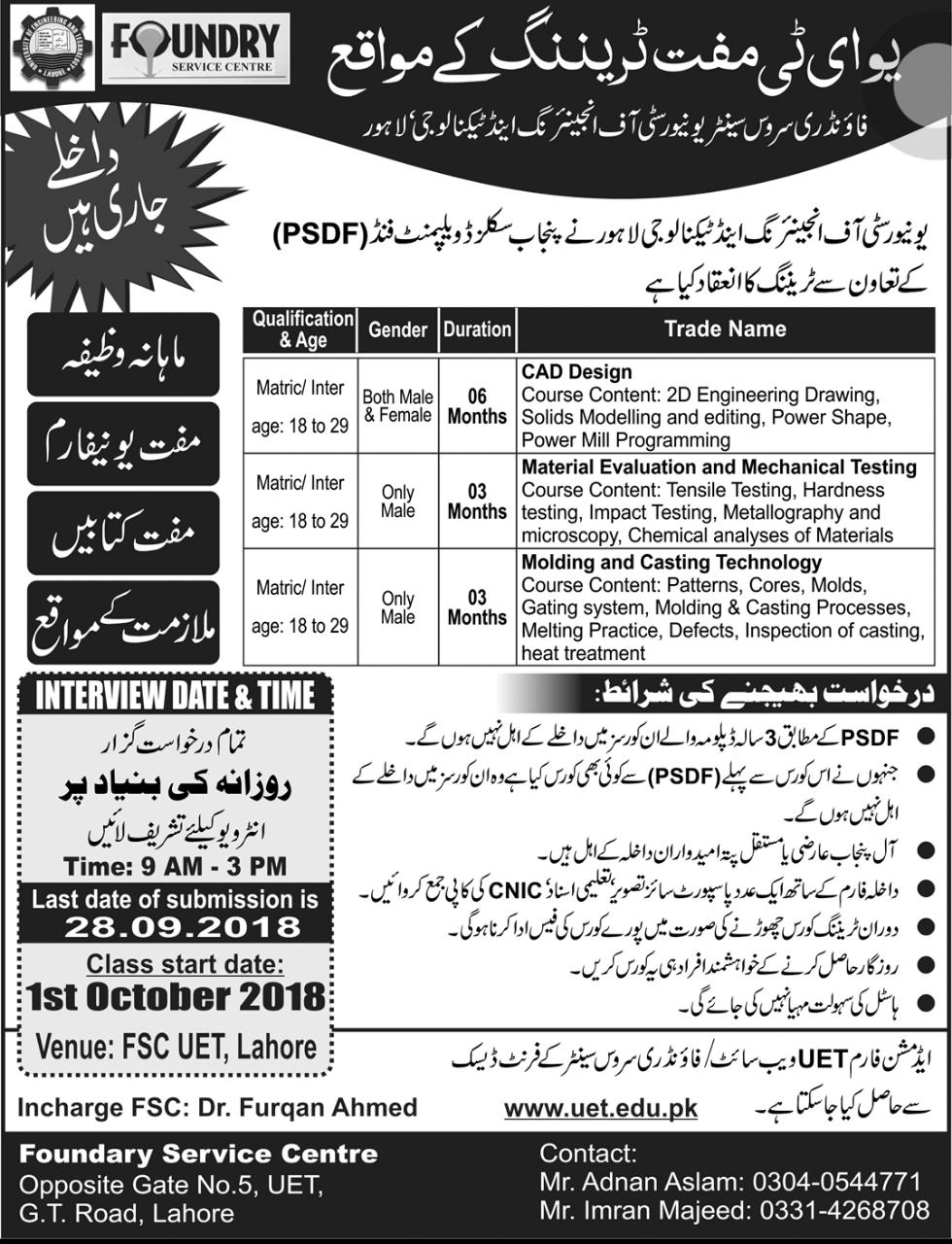 Lahore, University of Engineering & Technology Lahore has started the training with the collaboration of Punjab Skills Development Fund. The candidates need to know the detail of the programs in which training is being provided and they should send their application forms and the interviews of the candidates are being conducted on the daily basis. The last date for the submission of the admission forms is 28-9-2018. The classes will be started from 01 October 2018.