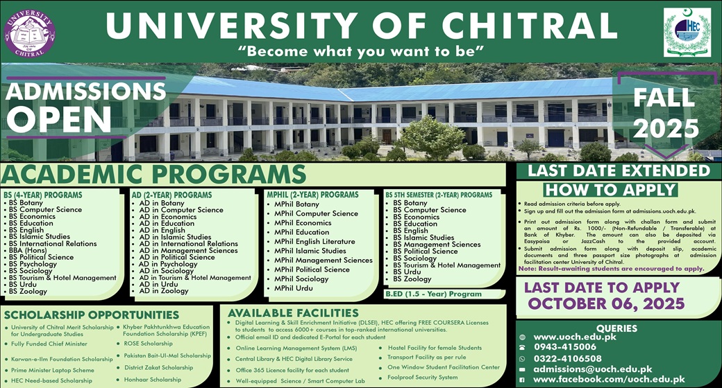 Action Point: Head over to the official University of Chitral website today, review the requirements, and submit your application before the new Last date to apply: 06 October 2025. Dont let this second chance slip away!