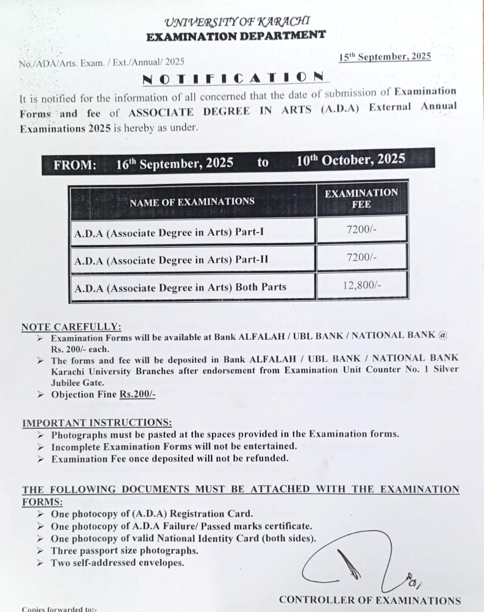 Karachi, University of Karachi will commence the external annual exams for 2025 in the Associate Degree in Arts. The students can participate in these exams by submitting their application forms and deposit the fee according to UoK ADA External Annual Exams 2025 Forms Schedule.