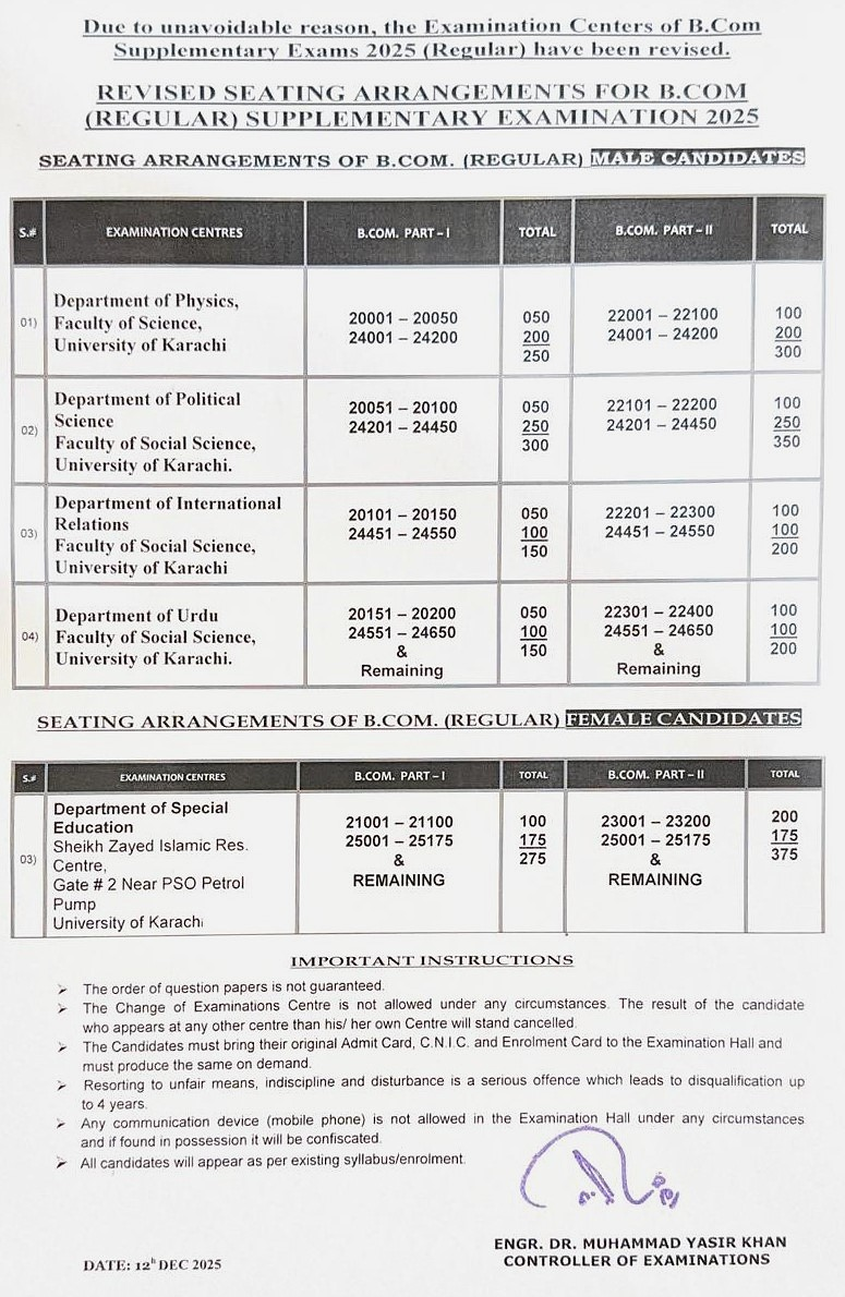 University of Karachi is going to start the B.Com Regular supply exams for the year 2025 on the scheduled dates and time. The students will follow the latest updates of UoK B.Com Regular Supply Exams 2025 Revised Seating Arrangements. The students are instructed to follow this seating plan, which is arranged now and the students will have to follow it at the time of appearing in the exams.