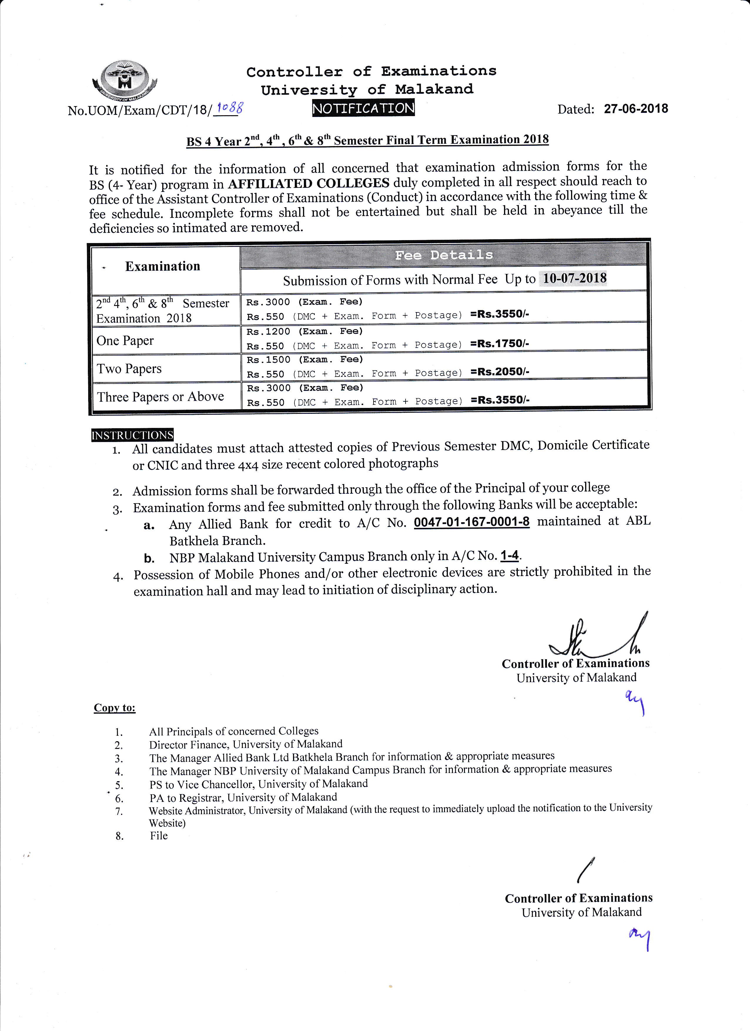 Malakand, University of Malakand has announced the complete schedule for the UoM BS 4 years 2nd, 4th, 6th and 8th semester final term exams 2018. The candidates can send their application forms till the final date of 10-7-2018 and they will deposit the fee of Rs.3000/- and the DMC, Form and postage charges of Rs.550/-. The candidates can deposit the fee of Rs.1750/- for one paper, Rs.2050/- for two papers and Rs.3550/- for three or above papers. The candidates should read the necessary instructions to follow and provide the information and also attach the documents with the admission forms. The candidates should attach attested copies of previous semester DMC, domicile certificate or CNIC and three passport size photographs. The candidates should deposit the admission fee at any branch of ABL and NBP, Malakand University campus branch.