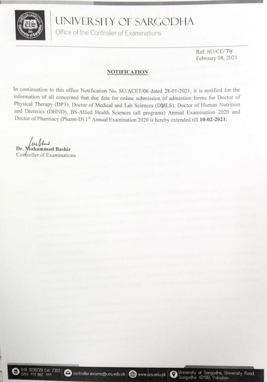 The University of Sargodha is now going to collect the admission form for various medical programs and courses for the UOS Medical Programs Annual Exams 2021. The Examination Department UOS has issued the UOS DPT DMLS DHND Pharma D BS Allied Sciences Annual Exams 2021 Schedule. According to the UOS 1st Annual Exams 2021 Forms Submission Schedule, the students of Doctor Physical Therapy DPT, Doctor of Medical and Lab Sciences DMLS, Doctor of Human Nutrition and Dietetics DHND and BS Allied Sciences can submit their admission forms up to 10-02-2021. All candidates are asked to follow the schedule and instructions properly to appear in the exams by submitting their admission forms.