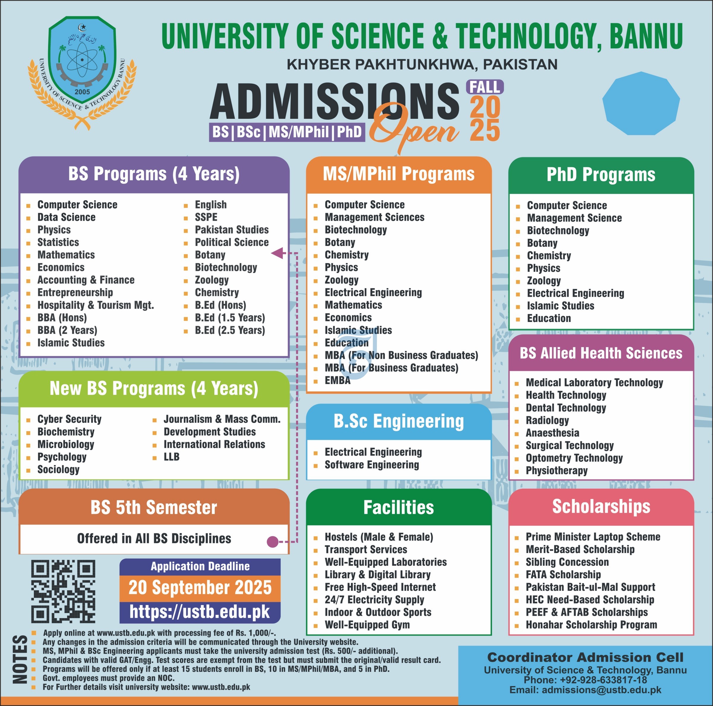 The University of Science & Technology, Bannu USTB invites applications for admission to its wide range of Undergraduate BS/B.Ed, Graduate MS/MPhil/MBA, and PhD programs for the Fall 2025 session. Aspiring students from all over Pakistan are encouraged to apply online by the application deadline: 20th September 2025.