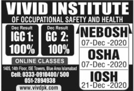 VIVID Institute of Occupational Safety Health invites applications for admissions 2021 for Safety Courses of NEBOSH(last date for apply 07 December 2020), IOSH(last date for apply 23 December 2020), OSHA(last date for apply 07 December 2020) in Islamabad.