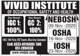VIVID Institute of Occupational Safety Health invites applications for admissions 2020 for Safety Courses of NEBOSH(last date for apply 09 November 2020), IOSH(last date for apply 23 November 2020), OSHA(last date for apply 16 November 2020) in Islamabad.