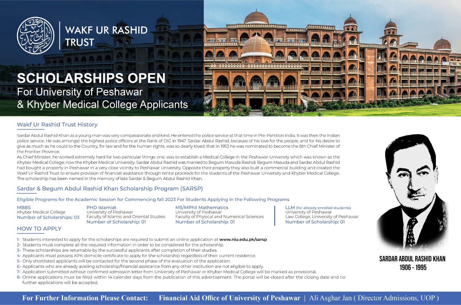 The Wakf ur Rashid Trust is a charitable organization dedicated to extending financial assistance to students currently enrolled at the University of Peshawar and Khyber Medical University. This trust proudly presents a range of scholarships to support students in their academic pursuits.