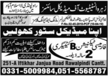 Zohra Institute Of Medical Sciences has announces admission for the year 2022. Zohra Institute Of Medical Sciences is offering admission for two year diploma of Pharmacy technician . Those who want get admission in this should apply before last date. This institution has a qualified staff and the highest level of education and provide good environment to the student.
