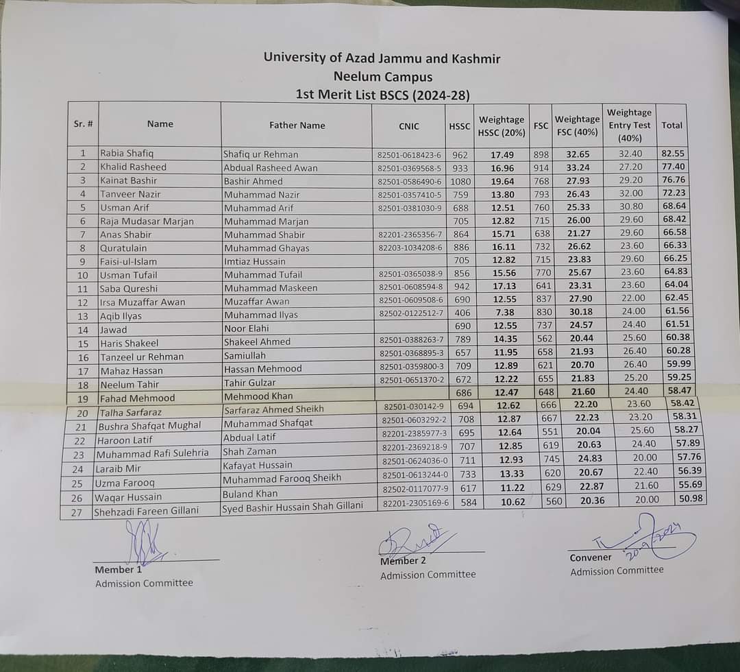 Merit List 2024 University of Azad Jammu and Kashmir Muzaffarabad BS