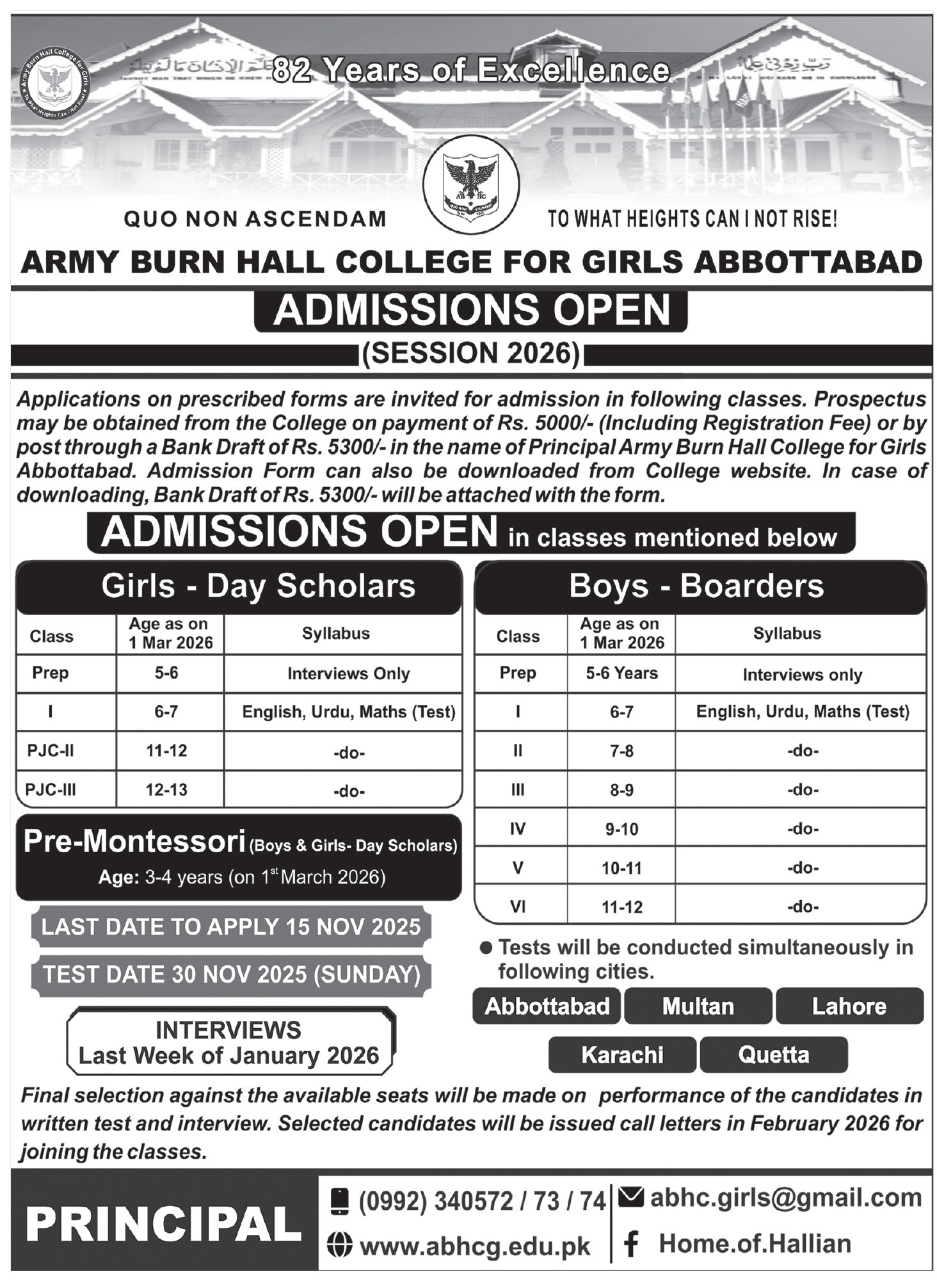 Army Burn Hall College For Girls Abbottabad Admissions 2025 |