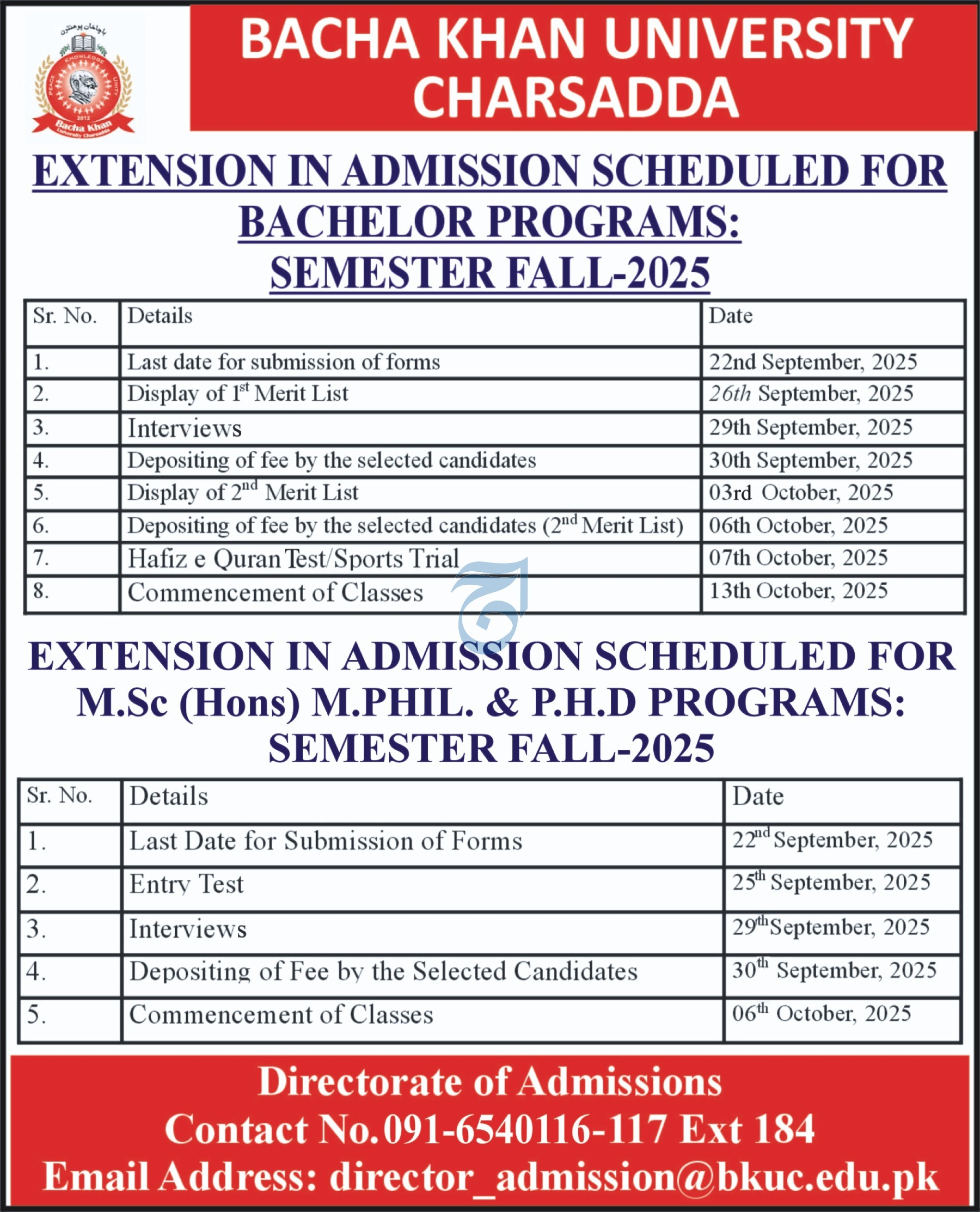 Bacha Khan University Charsadda BKUC is pleased to announce an extension in the admission schedule for its Bachelor, M.Sc Hons., M.Phil, and Ph.D. programs for Fall 2025. The University, founded in the spirit of peace, knowledge, and unity, continues to uphold the values of its namesake, the great freedom fighter Bacha Khan, by promoting quality education and academic excellence across Khyber Pakhtunkhwa and beyond.