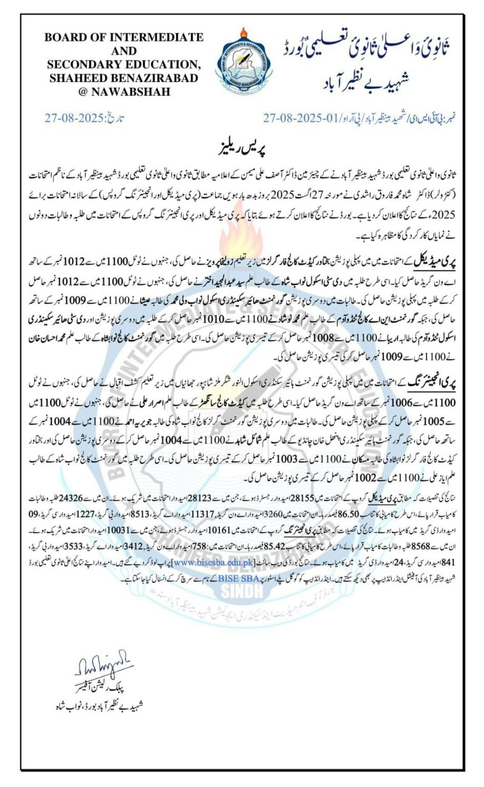 Board of Intermediate and Secondary Education Shaheed Benazirabad has made the announcement of the result of the science group of intermediate class part 2 first annual exams for the academic year 2025. The exams section started checking of the answer sheets of the participating students soon after finishing of the higher secondary school exams and now the exams department of BISE SBA has announced their result of the science group Pre-Medical and Pre-Engineering groups. The students can get the latest updates of BISE SBA Inter Part 2 Annual Exams 2025 Result.