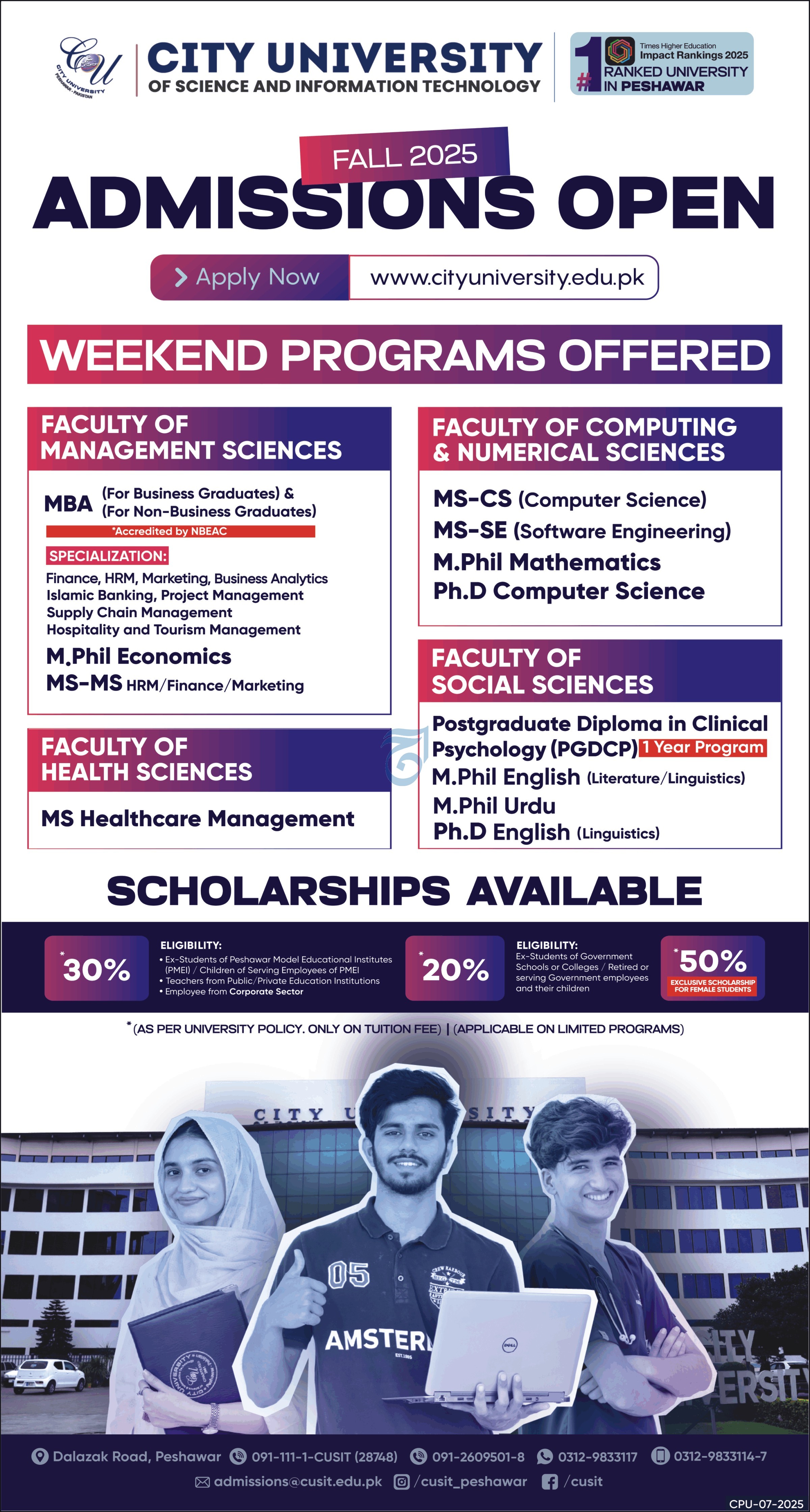 City University CUSIT invites applications for Fall 2025 admissions in its prestigious weekend postgraduate programs, designed for working professionals, business leaders, educators, and aspiring researchers. With a strong academic legacy and recognition in international rankings, CUSIT is committed to delivering high-quality, flexible education tailored to modern career demands.