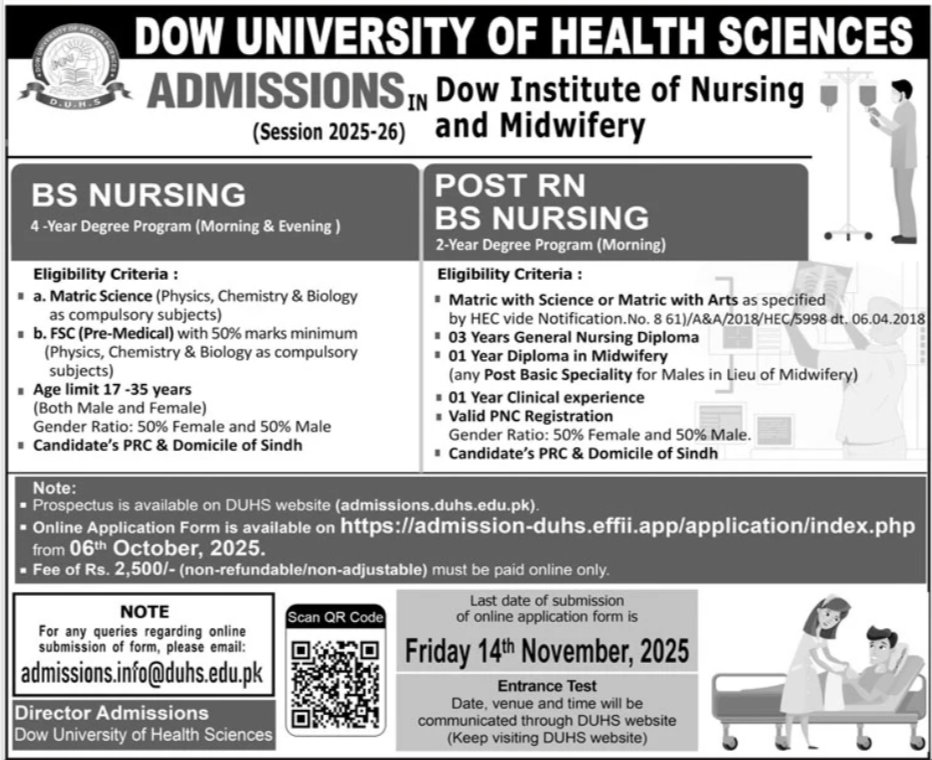 Dow University of Health Sciences DUHS, one of Pakistan’s premier institutions for healthcare education, invites applications for admission in its esteemed Dow Institute of Nursing for the Session 2025-26. Aspiring nursing professionals are encouraged to apply for the following programs: