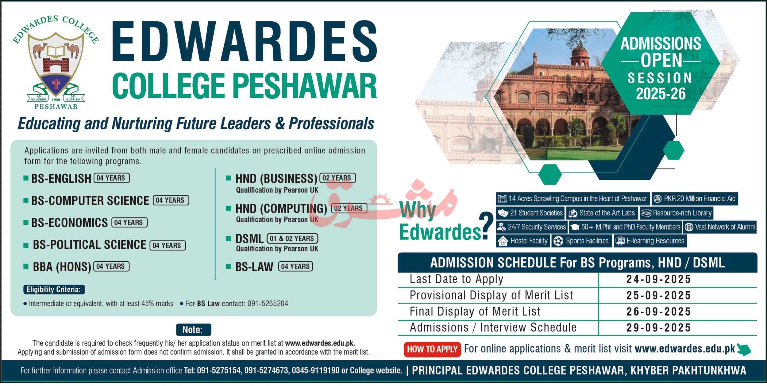 Edwardes College Peshawar invites applications from both male and female candidates for admission to a wide range of undergraduate and internationally recognized programs for the academic session 2025–26.