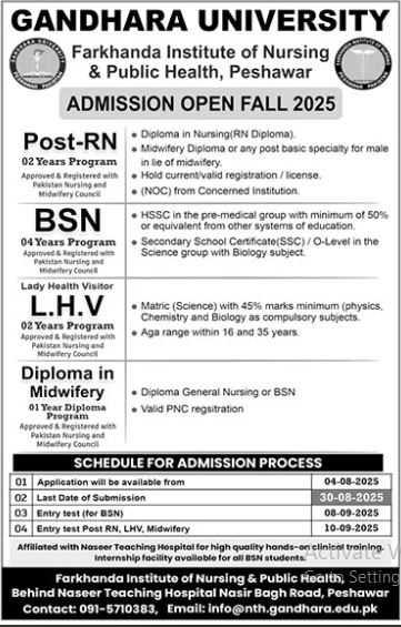 Gandhara University Farkhanda Institute of Nursing & Public Health in Peshawar is now accepting applications for its Fall 2025 session. The institute offers a variety of nursing and health-related programs approved and registered with the Pakistan Nursing and Midwifery Council PNMC, providing students with recognized qualifications and excellent clinical training.