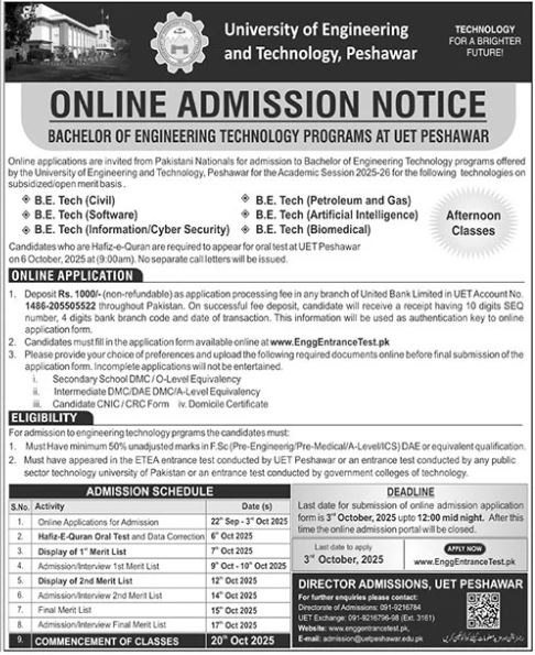 The University of Engineering and Technology UET, Peshawar, invites online applications from Pakistani nationals for admission to its Bachelor of Engineering Technology B.E. Tech programs for the academic session 2025-26. Admissions will be offered on both subsidized and open merit basis.