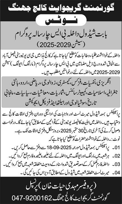 Government Graduate College Jhang, affiliated with Government College University Faisalabad GCUF, invites applications from eligible candidates male and female for admission to the BS Four-Year Degree Program in Morning and Evening sessions for the academic session 2025–2029.
