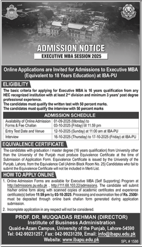 The Institute of Business Administration IBA, University of the Punjab PU, Lahore, is pleased to invite online applications for admission to the Executive MBA Program Session 2025. This program is designed for working professionals aiming to enhance their managerial and leadership capabilities while earning a degree equivalent to 18 years of education.