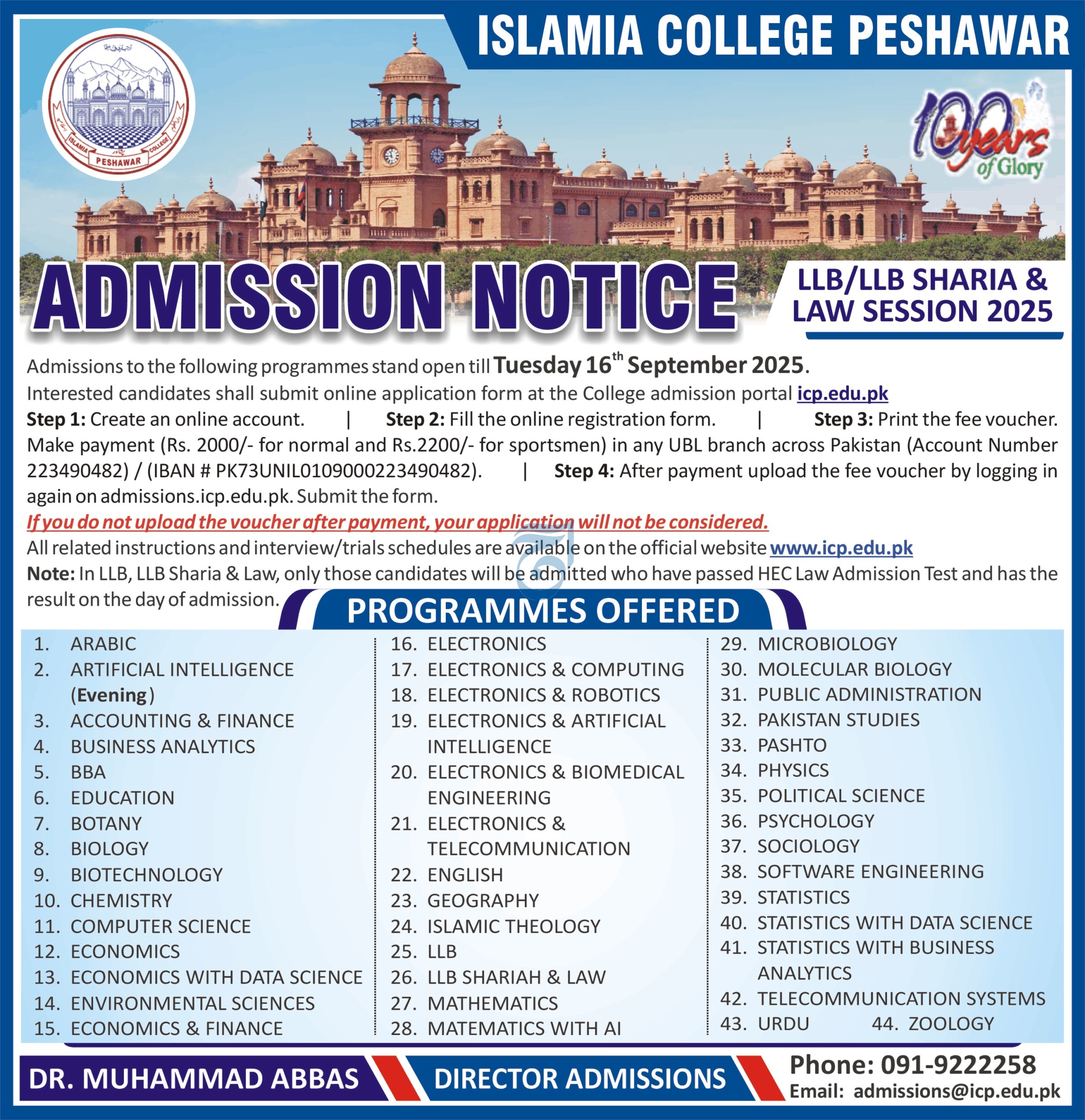 Islamia College Peshawar, a prestigious institution with a century-long legacy of academic excellence, announces open admissions for the 2025 session across multiple programs including the highly sought-after LLB and LLB Sharia & Law degrees.