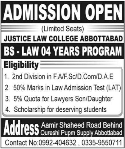 Justice Law College Abbottabad is now accepting applications for its Bachelor of Laws BS-LAW 4-year program. This is a great opportunity for aspiring legal professionals to begin their journey at a well-reputed institution committed to academic excellence and legal education.