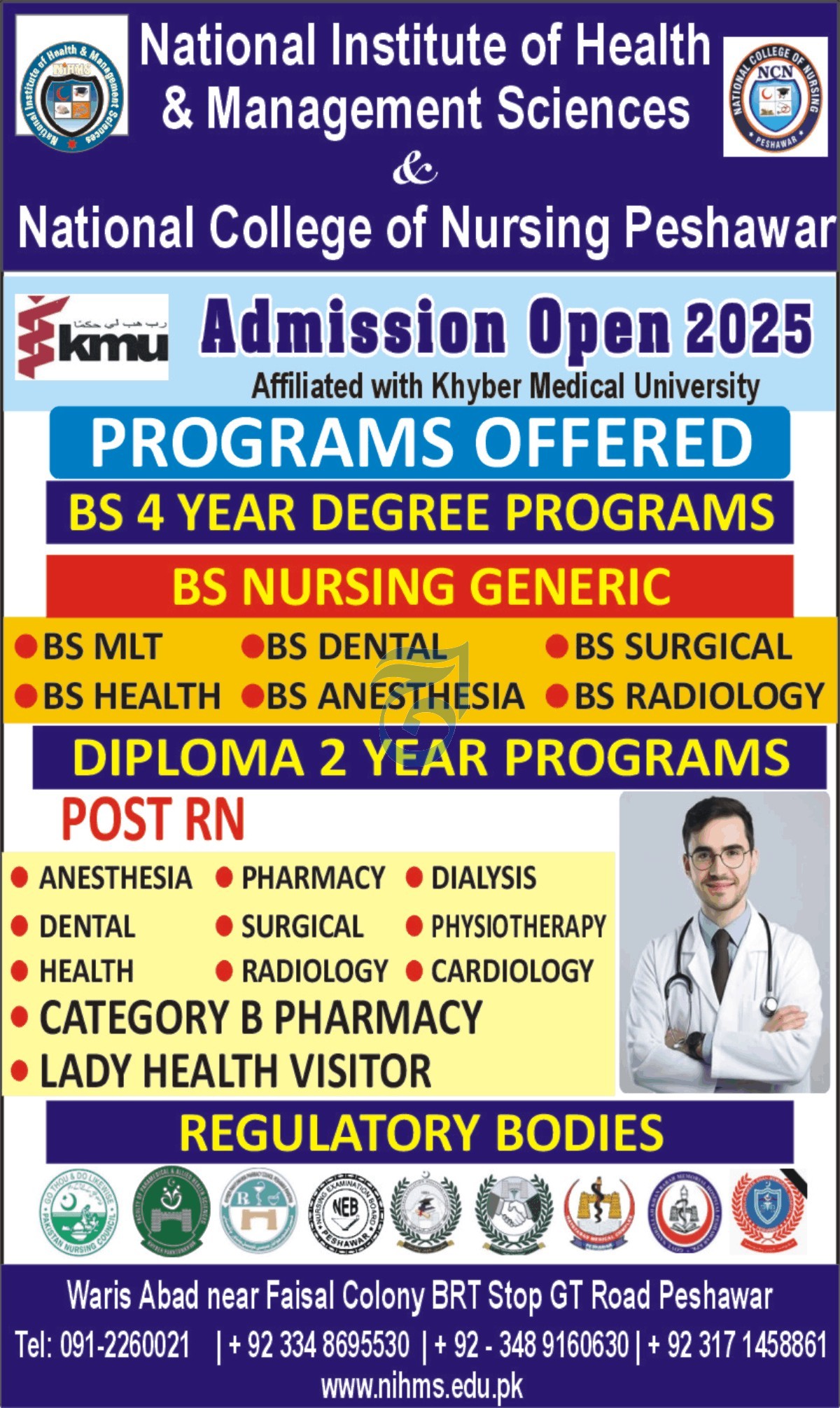 The National Institute of Health & Management Sciences and National College of Nursing NIHMS, Peshawar, are proud to announce that admissions are now open for 2025. Affiliated with Khyber Medical University KMU and recognized by all relevant regulatory bodies, our institutes are committed to producing competent, compassionate, and career-ready healthcare professionals.