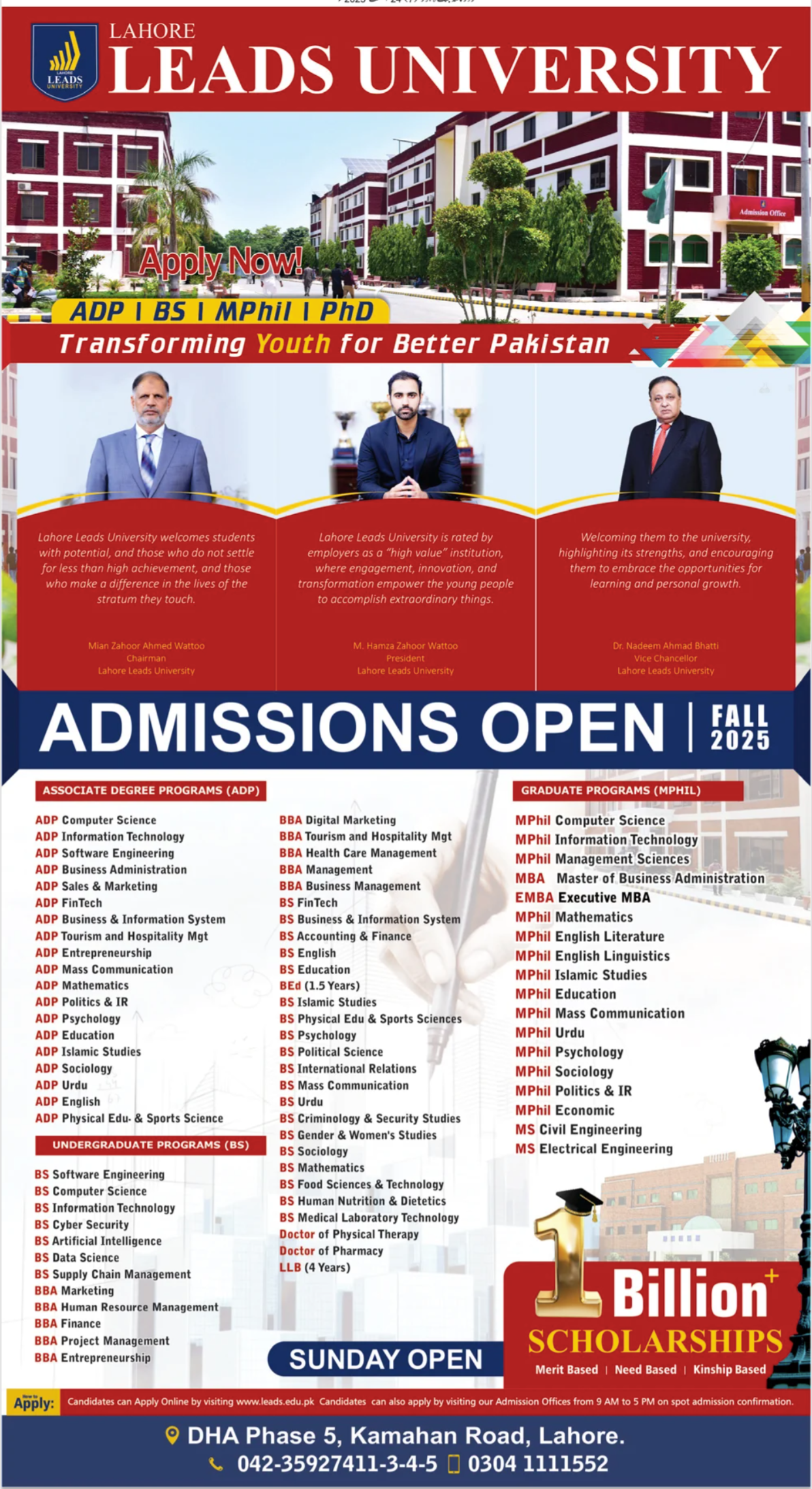 Lahore Leads University, one of Pakistan’s forward-thinking and dynamic institutions, is now accepting applications for its Associate Degree ADP, BS, MPhil, MS, MBA, and PhD programs for the Fall 2025 intake. With a commitment to academic excellence, innovation, and social impact, Leads University invites students to embark on a journey of transformation and success.