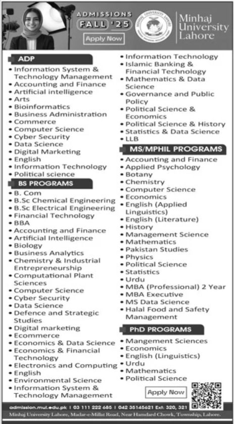 Minhaj University Lahore MUL, a recognized hub of academic excellence, is now accepting applications for Fall 2025 admissions across a wide range of undergraduate, graduate, and PhD programs. If youre looking to shape your future in a dynamic, career-focused environment — this is your opportunity.