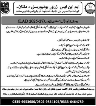 Government Pak-German Polytechnic Institute for Agricultural Technology at the MNS University of Agriculture Multan MNSUAM Admissions are now open 2-year Livestock Assistant Diploma LAD program.