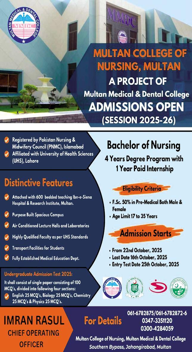 Multan College of Nursing Admissions Offered Bachelor of Nursing BSNDuration: 4 Years + 1 Year Paid Internship