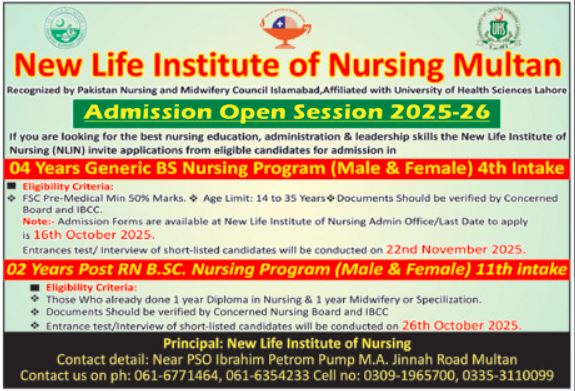 New Life Institute of Nursing Multan, welcomes your application for Session 2025-26.Recognized by the Pakistan Nursing and Midwifery Council PNMC, Islamabad, and affiliated with the University of Health Sciences UHS, Lahore, NLIN is committed to preparing the next generation of compassionate, skilled, and professional nurses.