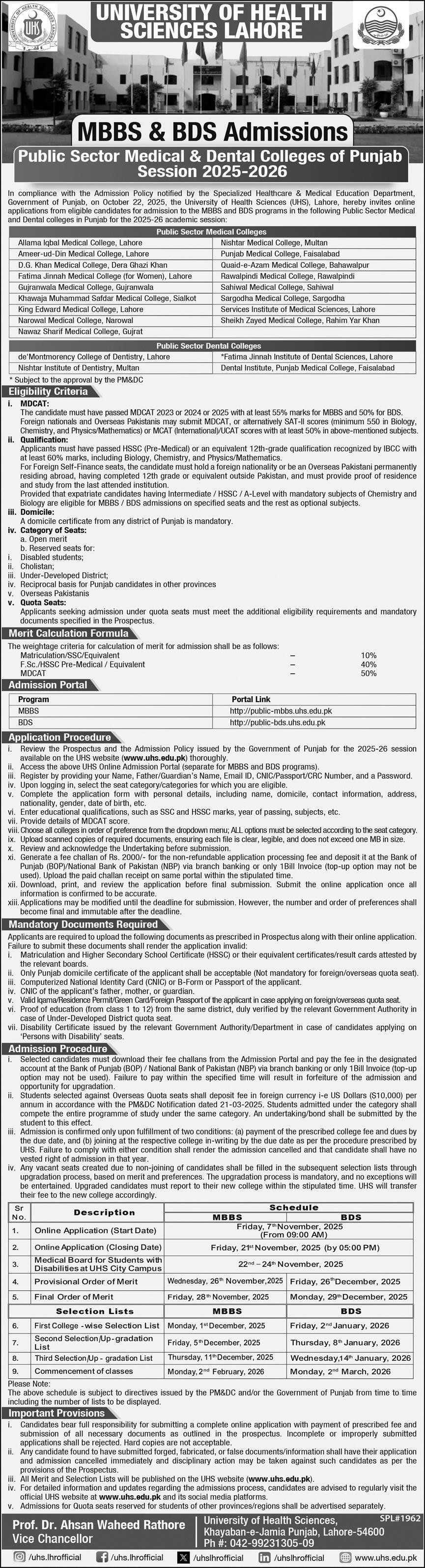 The University of Health Sciences UHS, Lahore, has officially opened online applications for MBBS and BDS admissions in all Public Sector Medical and Dental Colleges of Punjab for the academic session 2025–2026. The admissions are being conducted in accordance with the Admission Policy notified by the Specialized Healthcare & Medical Education Department, Government of Punjab, dated October 22, 2025.