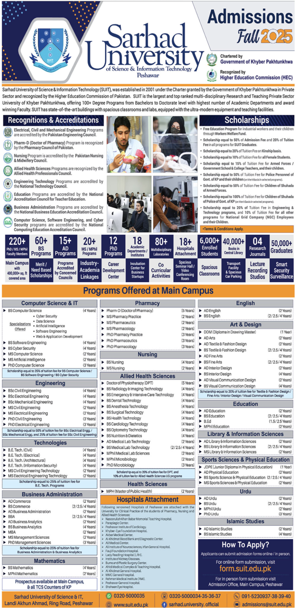 Established in 2001 under a charter granted by the Government of Khyber Pakhtunkhwa, Sarhad University of Science & Information Technology SUIT is a top-ranked private sector university, recognized by the Higher Education Commission HEC of Pakistan.