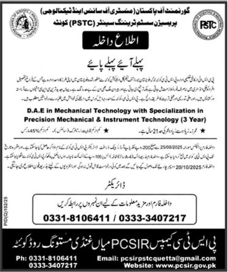 The Precision Systems Training Centre PSTC, Quetta, operating under the Ministry of Science and Technology, Government of Pakistan, is pleased to announce admissions for the Diploma of Associate Engineering DAE in Mechanical Technology, with specialization in Precision Mechanical & Instrument Technology.