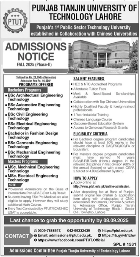 Punjab Tianjin University of Technology PTUT Lahore is now accepting applications for Fall 2025 Phase-II in both Bachelor’s and Master’s degree programs. As a pioneer in applied technology education, PTUT offers modern, industry-driven programs aligned with international standards.